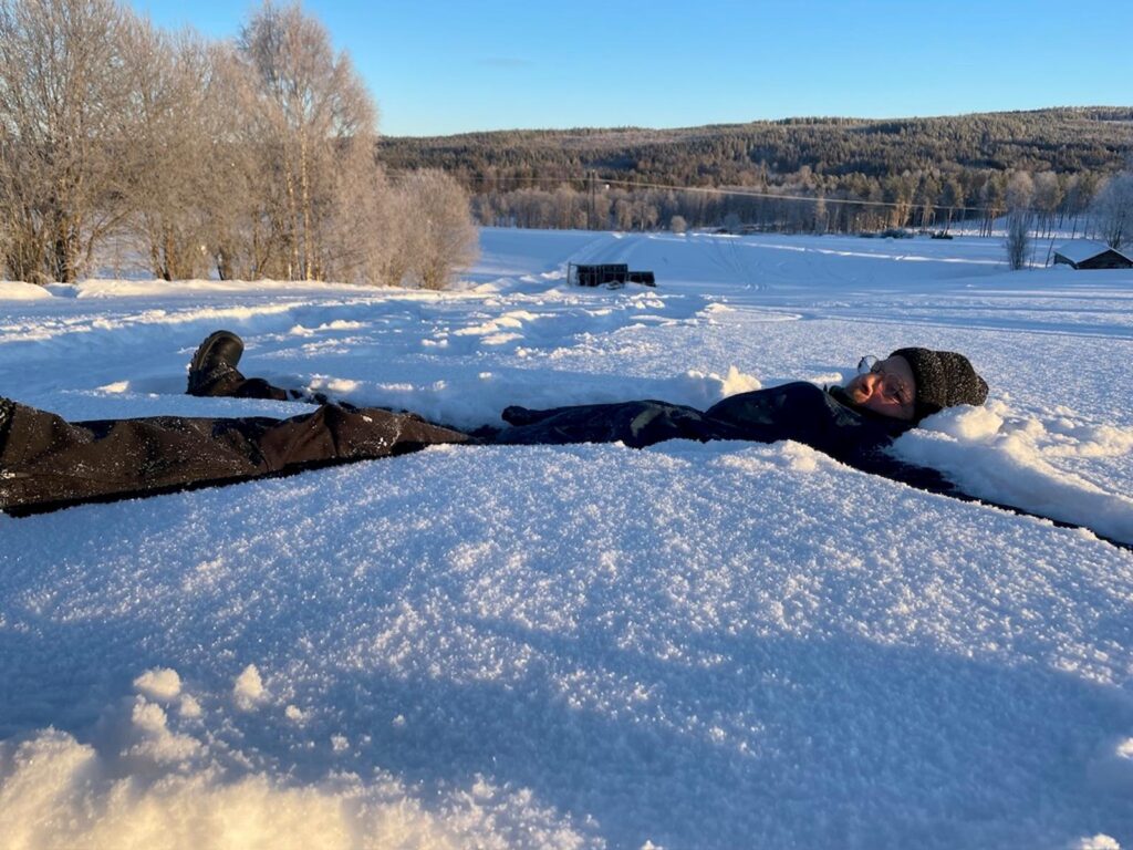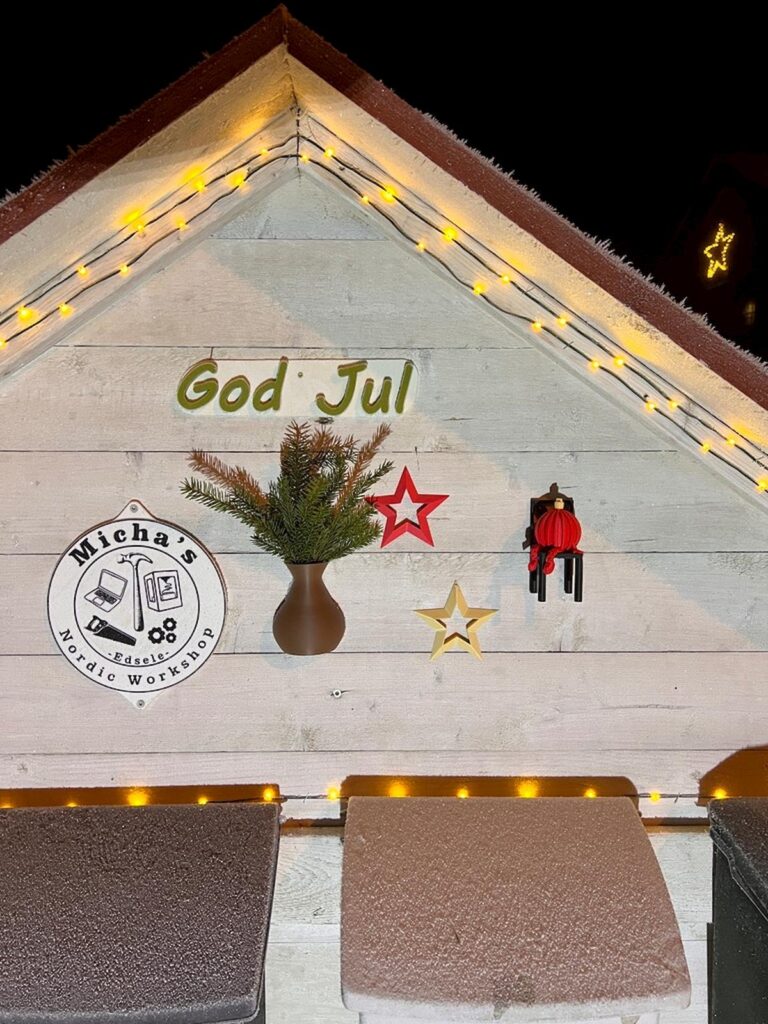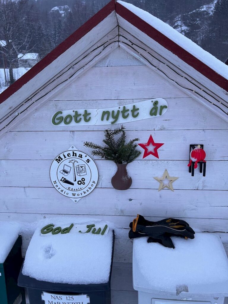 Anfang Dezember wurde dann auch die Winter- und Weihnachtsdekoration draußen und drinnen aufgestellt. Das Briefkastenbord entsprechend aufgepeppt und ich war mit meiner kleinen Selbstständigkeit auf dem Weihnachtsmarkt in Ramsele. Der beste Fund vom Weihnachtsmarkt war ein Handschuh für das Mikrofon meines Headsets. Wir durften bei Freunden im Garten einen Weihnachtsbaum schlagen, es kam mehr Schnee und noch ein paar kleine Aufträge für meine Selbstständigkeit. Mitte Dezember kam dann unser Sohn wieder zu Besuch und wir chillten dann bis kurz nach Weihnachten. Bei heftigen Windböen haben wir ihn dann wieder zum Zug gebracht und haben ein paar Tränen vergossen. Silvester haben wir mit Freunden und Bekannten verbracht und waren somit nicht alleine. Es war fröhlich und doch gemütlich mit einem kleinen Feuerwerk, knackig kalt und mit neuem Schnee ging’s dann in 2026.