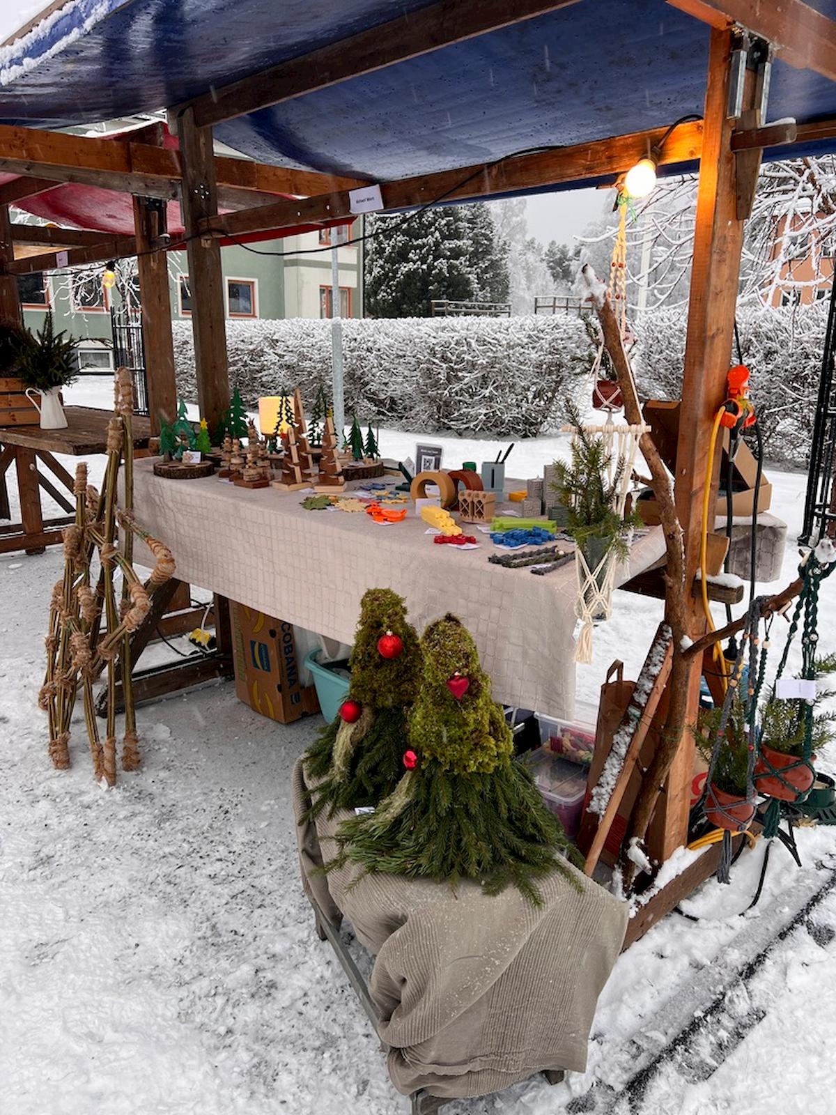 Anfang Dezember wurde dann auch die Winter- und Weihnachtsdekoration draußen und drinnen aufgestellt. Das Briefkastenbord entsprechend aufgepeppt und ich war mit meiner kleinen Selbstständigkeit auf dem Weihnachtsmarkt in Ramsele. Der beste Fund vom Weihnachtsmarkt war ein Handschuh für das Mikrofon meines Headsets. Wir durften bei Freunden im Garten einen Weihnachtsbaum schlagen, es kam mehr Schnee und noch ein paar kleine Aufträge für meine Selbstständigkeit. Mitte Dezember kam dann unser Sohn wieder zu Besuch und wir chillten dann bis kurz nach Weihnachten. Bei heftigen Windböen haben wir ihn dann wieder zum Zug gebracht und haben ein paar Tränen vergossen. Silvester haben wir mit Freunden und Bekannten verbracht und waren somit nicht alleine. Es war fröhlich und doch gemütlich mit einem kleinen Feuerwerk, knackig kalt und mit neuem Schnee ging’s dann in 2026.